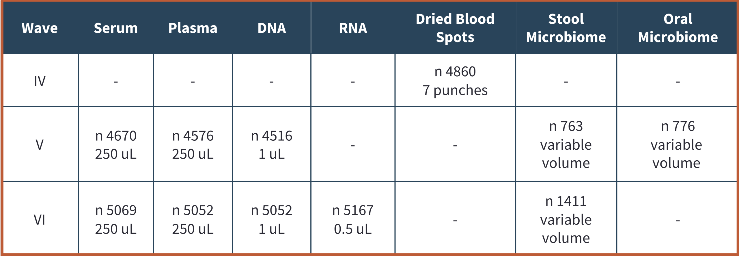 Add Health maintains a repository of biospecimens that were collected at various timepoints during the study that are available for current use in research. For more information about the use and storage of biospecimens in Add Health, please review the Biospecimen Reserve Policy.